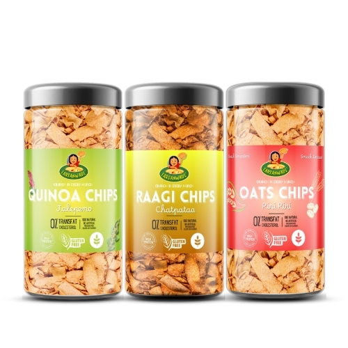 This exciting combo features Quinoa Jalapeno, Raagi Chatpataa, and Oats Piri Piri chips. Packed with bold spices and made from supergrains, it delivers a crunchy and flavorful snacking experience that is both satisfying and better-for-you.