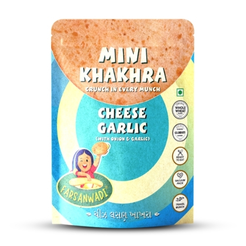 This is a Mini Sized Khakhra Pack of 50 Grams. A perfect blend of rich cheese and aromatic garlic on a crunchy whole wheat base. This high-protein snack is both indulgent and healthy, making it a great alternative to fried snacks.