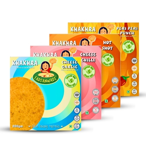 This power-packed combo brings together Cheese Garlic, Cheese Chilli, Hot Shot, and Peri Peri Punch for an intense flavor experience. Made from 100% whole wheat and roasted to perfection, these khakhras offer a crunchy, fiber-rich snack with a perfect balance of spice and indulgence.