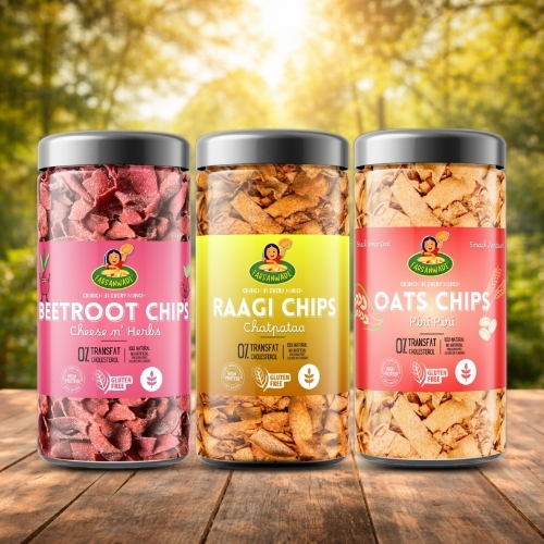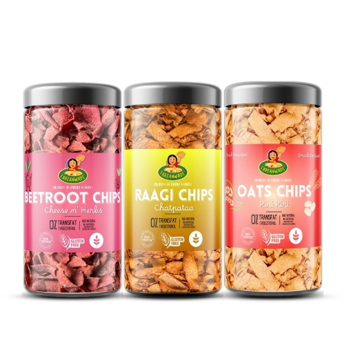 This wholesome combo brings together Beetroot Cheese N’ Herbs, Raagi Chatpataa, and Oats Piri Piri chips. Made with a blend of supergrains, it offers a perfect balance of taste and nutrition. Light, crispy, and flavorful, it’s an ideal snack for those looking for a better alternative to regular chips.