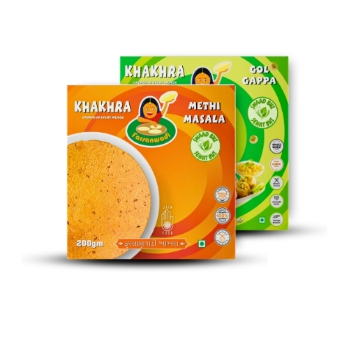 Enjoy the vibrant taste of India with this chatpata combo featuring Methi Masala and Golgappa flavors. Made from 100% whole wheat, these khakhras are roasted, not fried, offering a crunchy and flavorful snacking experience packed with fiber and plant-based protein.
