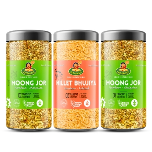 This combo features Chatpataa Moong Jor and Takatak Millet Bhujia, delivering a mix of tangy and crispy flavors. Made from roasted ingredients, it provides a light, nutritious, and protein-rich alternative to fried snacks.